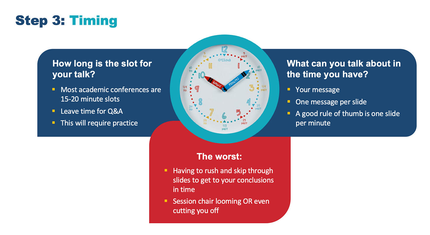 We’ve all been in conference talks when the presenter has not prepared properly …. They have to skip through slides to get to the end in time while the session moderator looms over there. Rule of Thumb: One slide per minute and leave time for questions!