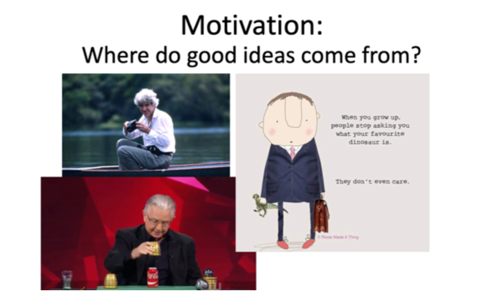 Where do good ideas for research projects come from? This is a very common question: “How can I come up with good research idea?”. The answer is: give yourself time to think. Get away from the daily emails/meetings/university work. Here you have Bill Hamilton, a leading evolutionary biologist, who used to go fishing to come up with ideas. One of my favorite magicians (a hobby of mine) who always “sleeps with a pen and paper by his bed” in case he misses an idea. My ideas come from fossils: What’s your favorite dinosaur?